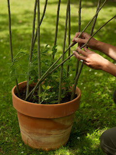 Klipp till de pinnar som ska stickas ner i jorden, de bör